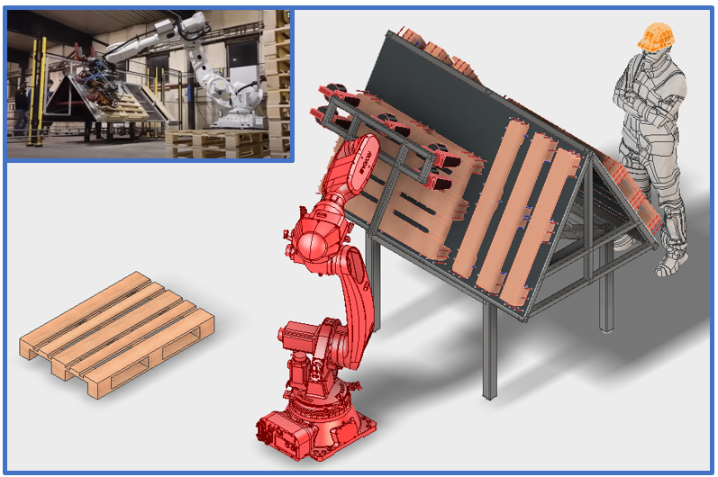 Оператор устанавливает шашки и доски по шаблону на поворотном столе, по готовности оператор разворачивает стол к роботу. Робот забивает гвозди в паллет и снимает готовый паллет с поворотного стола. Ограждения робота оснащены замками безопасности и реле безопасности уровня SIL2, чтобы предотвратить попадание оператора в зону сборки паллет.